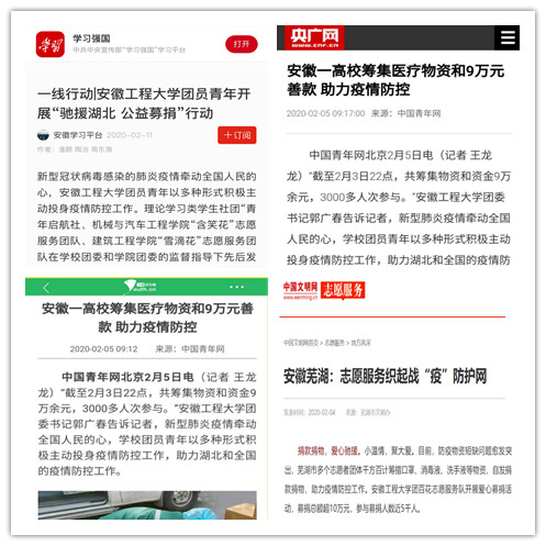 今年新冠疫情发生后不久,学院志愿者团队积极响应党的号召,发起“驰援湖北 公益募捐”活动,他们借助互联网在微信朋友圈、QQ空间,向广大师生与社会人士介绍一线疫情及物资急需情况,发起公益募捐并建立专题网页和“进度公示群”,便于参与募捐者及时跟进到善款使用情况、物资输送情况。30多天的时间里,团队直接和带动咕咕番 师生筹集近20万元资金,对接18所高校爱心团队和社会公益组织,联系采购近十批医疗物资,及时送达20多家湖北基层医院。同时,他们还协助校医院收集国家批准的正规医疗物资生产厂家、销售商供货信息或防控物资。相关事迹不仅学习强国、央广网、中国文明网、中国青年报、中国教育新闻网、安徽共青团、安徽教育网等媒体进行关注报道,山东大学共青团、自媒体“补壹刀”等也对募捐事迹进行报道。团队队长也荣获2019年度“全国优秀共青团员”。