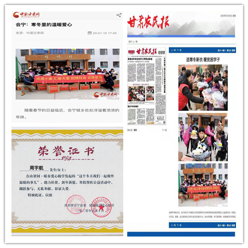 学院“公益N+1”团队以爱心助学为己任,团队于2019年11月发起爱心衣物、学习用品捐赠活动,向甘肃省会宁县、安徽省利辛县、河南省郏县贫困儿童捐赠200余件学习用品,1700余件秋冬季衣物。2020年4月发起爱心助学活动,目前已对接10位贫困学生(6名甘肃省会宁县、4名安徽省亳州市),每月资助其200—500元助学资金,持续三年,截止目前已有120余位来自来自清华大学、南开大学、南京航空大学等国内二十多所高校的志愿者参与其中。事迹先后被中国甘肃网,甘肃农民报报道,团队成员也被甘肃会宁县团委授予“爱心志愿者”。
