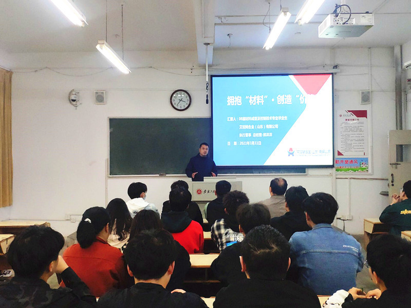 3月31日下午,材料学院在2教105举办2021年首场校友创业大讲堂。材料成型及控制工程专业2008届校友、艾坦姆合金(山东)有限公司执行董事、总经理郏洋洋应邀我院2020级学生作题为“拥抱‘材料’ 创造‘价值’”专题报告。