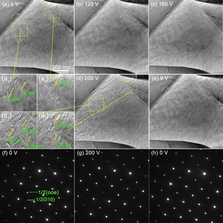 弛豫铁电材料在储能效率方面具有巨大优势,然而由于实际应用中不同性能参数之间的微妙平衡,以及理论上对充放电过程中局域结构演变规律的研究不足,很难获得理想的综合储能特性。该课题组在前期大量工作的基础上开展了针对性研究,通过多重协同设计,一方面引入具有大的极化位移的Li离子与具有6s孤对电子的Bi离子来提高极化强度,另一方面引入局域随机场来调控电畴尺寸,成功制备了综合储能性能优异的NaNbO3-(Bi0.5Li0.5)TiO3无铅弛豫铁电陶瓷,具有超高的放电储能密度~8.73 J/cm3,高储能效率~80.1%,优异的温度稳定性(±6%,25~200 oC)以及超快放电速率(t0.9<85 ns)。特别是,通过原位透射电子显微镜和拉曼光谱进一步分析了施加和卸载电场过程中局域结构的演变过程,揭示了获得优异储能性能的结构机理。原位多尺度结构的演变规律与优异储能性能之间关系的深入理解将为未来开发高储能性能的弛豫铁电材料提供了理论指导。