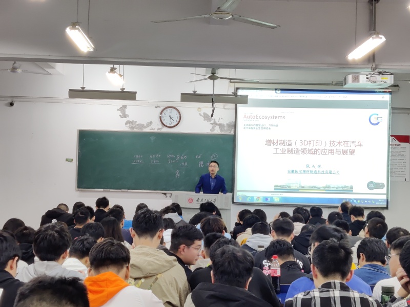 芜湖点金机电科技有限公司创办人、总经理王德伟和安徽拓宝科技有限公司的创办人、技术总负责、总经理张成林两位产业教授应邀分别为同学们作大学生如何应对就业、增材制造(3D打印)在汽车、工业制造领域的应用与展望专题报告。王德伟和张成林分别就大学生就业工作中专业知识、职业道德、工作专注度、再学习及专业知识的应用、创业历程等方面分享他们的工件经历、经验收获以及取得的工作业绩。