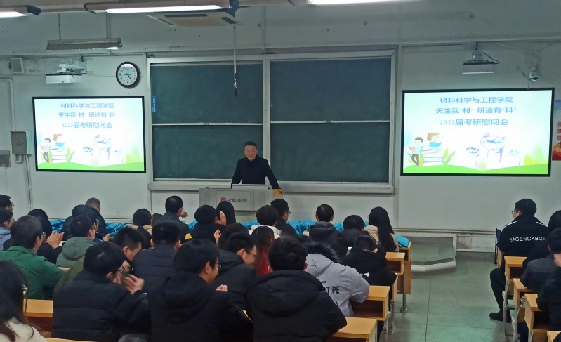 为鼓励2022届材料学院考研学生坚持不懈,自信迎考,12月9日下午,我院在2J206举行天生我“材”,研途有“料”--2022届考研学生慰问会。学院党委书记王勇智、院长左如忠、副院长朱协彬和刘琪、教师支部书记和系负责人、团委书记以及毕业班辅导员参加慰问活动。活动由院长左如忠主持。