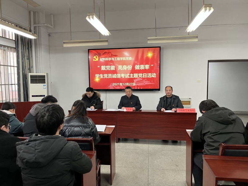 为进一步落实立德树人根本任务,强化党支部的战斗堡垒作用,充分发挥学生党员“五带头”作用,进一步加强学风、考风建设,12月28日下午,材料学院在B203报告厅举办“戴党徽、亮身份、做表率”学生党员诚信考试主题党日活动。学院党委书记王勇智出席活动并讲话,全体学生党员参加。活动由院党委副书记方玖胜主持。