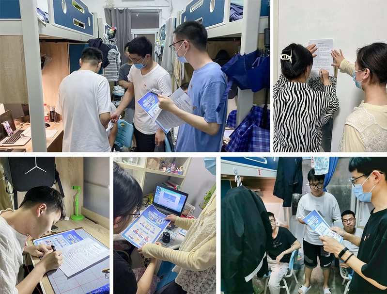 凝聚抗“疫”合力,强化责任担当。为保证疫情防控常态长效,支部“防疫知识宣传”志愿服务队分包责任,分为四小分队深入到研究生宿舍进行了疫情防控知识的宣传和卫生大检查,引导同学们养成自觉科学佩戴口罩和开窗通风、及时清理垃圾的好习惯。志愿服务队将支部精心制作的疫情防控“三件套”“五还要”宣传海报交到了每个宿舍成员手中,同时让大家现场签订宿舍版的疫情防控倡议书,由小队长一并张贴于宿舍墙上。通过与同学们的沟通交流,尽可能了解大家的需求、建议以及心理状态,并积极向党组织反馈,寻求解决方案。