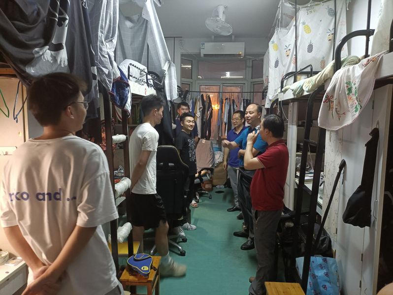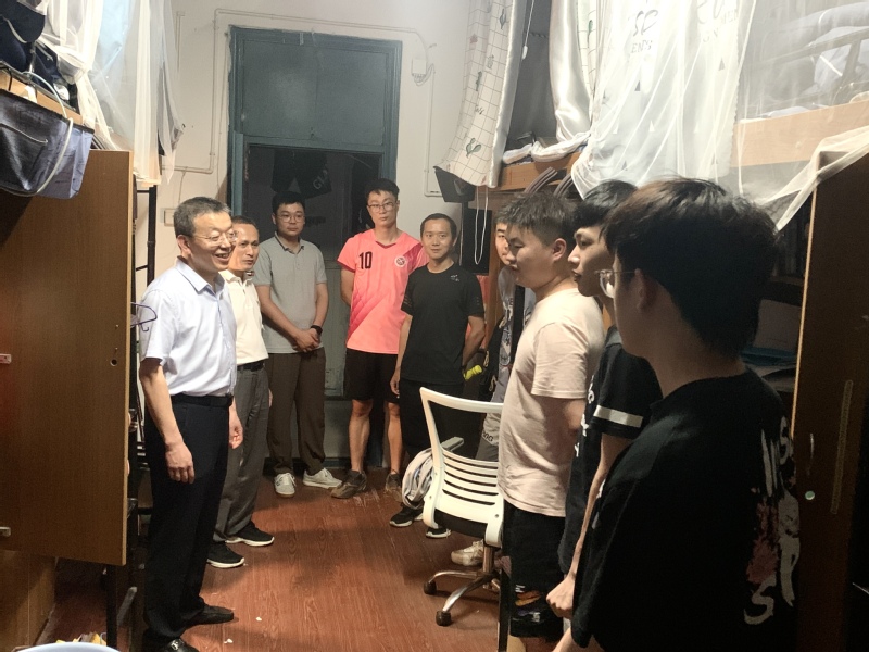 6月2日晚上,咕咕番 党政领导王勇智、方玖胜、朱协彬、刘琪带领系部主任、支部书记、团委书记、办公室主任及辅导员到男生宿舍18、19、20、21号楼和女生6、11号楼亲切看望2022届毕业生。