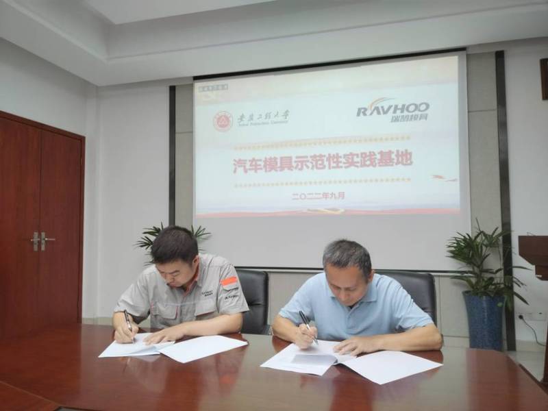 朱协彬与张锋代表校企双方为“汽车模具示范性实践教学基地”揭牌,签订《咕咕番 与瑞鹄汽车模具共建“示范性实践就业教学基地”协议书》。