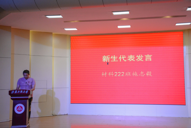 新生代表、材科222班施志毅同学在发言中认为,奋斗是青春最佳答卷,他向2022级新生发出倡议:铭记“尚德敏学 唯实惟新”的校训,在今后的学习生活中锐意进取,砥砺前行,在为咕咕番 更好发展添光添彩中绽放青春、再创辉煌。