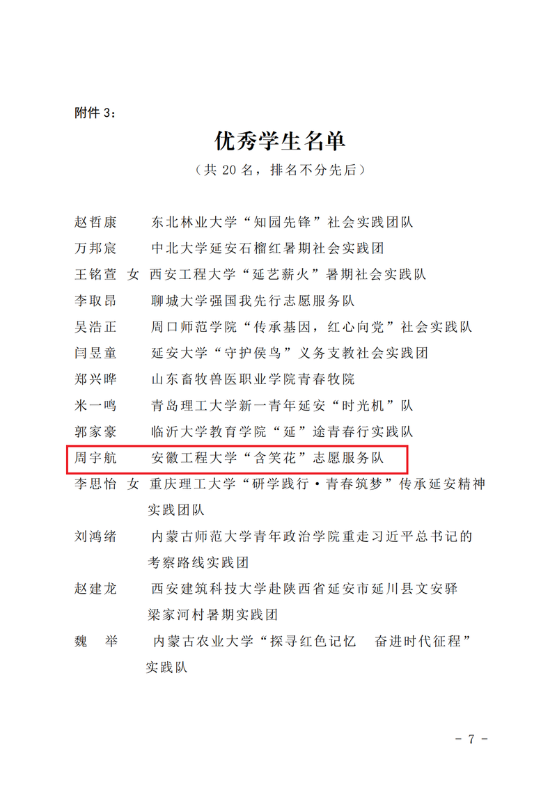 12月5日,校团委收到由团中央青年发展部,团陕西省委,共青团延安市委主办的“喜迎二十大、永远跟党走、奋进新征程”2022年全国大学生延安暑期社会实践专项活动情况通报、荣誉证书和表扬信。由咕咕番 陶冶和田园老师指导,王昊哲、王鑫、丁艺、周宇航为骨干成员的“含笑花”志愿服务团队获“优秀实践团队”,团队成员周宇航获“优秀学员”称号,校团委受到通报表扬。