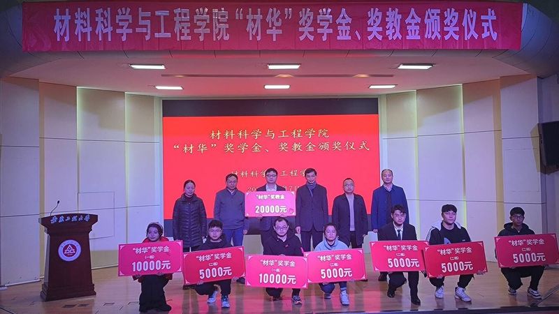 刘金斌、郭广春、左如忠、刘琪为获得“材华”奖学金、奖教金的师生颁奖。