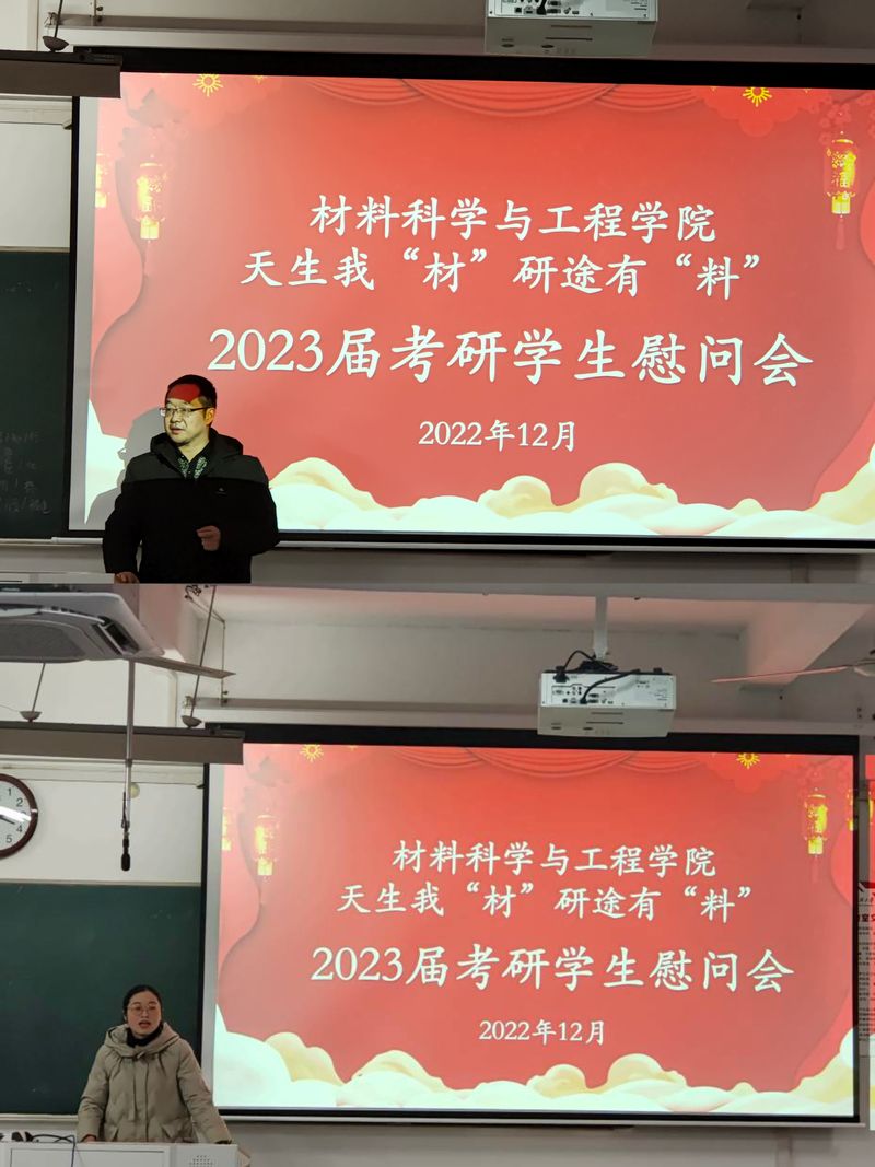 为帮助考研学生缓解备考压力,坚定考研信心,积极冲刺迎考,12月8日下午,材料学院在6J213开展2023届考研学生慰问活动。学院党政领导、各系部负责人、各党支部书记、团委书记、毕业班辅导员共同为2023届考研学生送温暖祝福,本次活动由院党委副书记方玖胜主持。