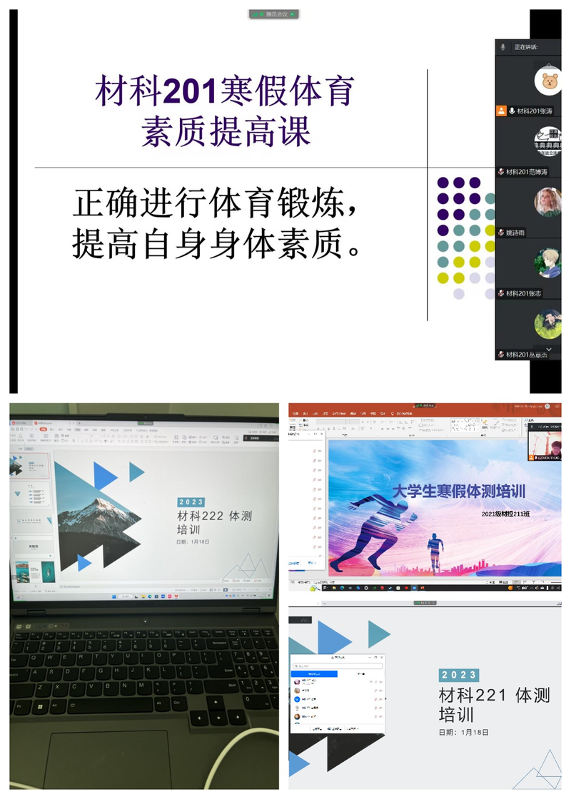 随着假期的深入,学员们的运动也逐渐进入满电模式,热情和干劲十足。学员们的运动项目丰富多彩,不仅有布置的锻炼项目跑步、引体向上等,还有自己喜欢的运动方式,如打羽毛球、俯卧撑、仰卧起坐等等。在不断完善自身身体素质练习的基础上,他们还将所学的知识在各自班级进行了线上授课。其中,材科211杨电庆说到,其在认真观看了老师的直播之后,将老师讲的动作要领和细节与体测时自己的动作对比,并牢记细节,认真体会,在家慢慢练习小细节,在线上时将自己学到的动作细节教给班内的同学们。用心模仿老师的动作,简而易懂地讲解动作细节,让同学们能够真正理解与体会动作要领。材科202许志杰提到,在班级授课中我经过前期实践后,告诉大家找单杠练习怎么抓握和如何前面怎么锻炼,由于下雨原因,跑步没有场地示范,就在网上找了1000米长跑姿势和引体向上的技巧的视频,然后通过看视频学习,并将视频发到群里学习,让同学们反复观看。材科201张涛说到,通过体育训练营的培训,知道了正确的锻炼方法,并在实际生活中加以运用,也通过在网上寻找相关的视频巩固学习,在给班级同学教学时,通过ppt的形式让同学了解体测的意义和知识,跟他们分享自己的经验,并在网上找了相关的视频播放给同学们学习,并且通过这次学院体育训练营寒假活动的开展,感受到了体育的乐趣,也不像以前假期在家天天睡懒觉,体质变得越来越好。