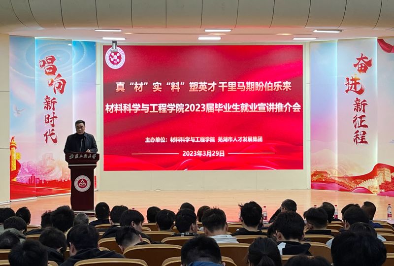 3月29日下午,由咕咕番 、芜湖市人才发展集团联合举办的2023届毕业生就业宣讲推介会在学术报告厅举行。校党委常委、副校长郑健,校学生处处长、大学生就业创业指导中心主任黄炜,芜湖市紫云英人才服务公司总经理宋丽丽,学院产业教授、安徽众源新材料股份有限公司副董事长兼副总经理吴平、国家智能铸造产业创新中心总经理宋亮,瑞鹄汽车模具股份有限公司技术总监张威,校征兵工作站负责老师赵成婧应邀出席。会议由学院党委书记郭广春主持。