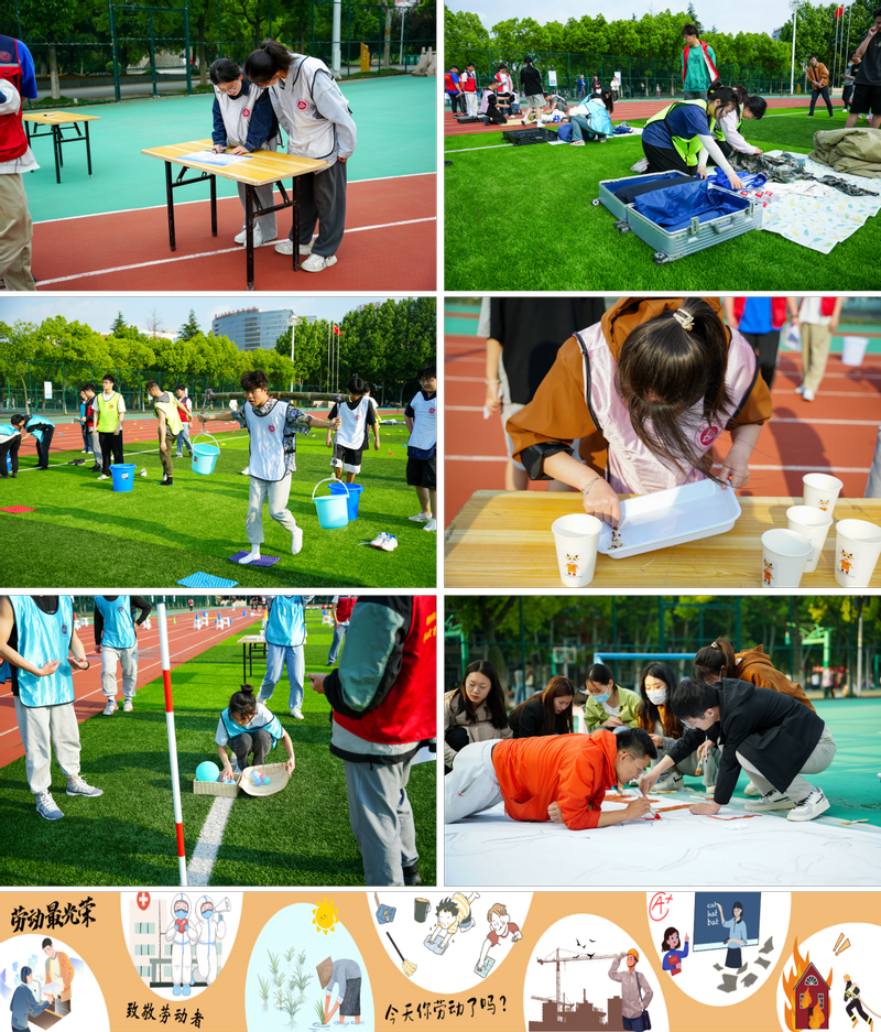 劳动技能大比拼分为知识答题、行李收纳、趣味农耕挑战赛、长图画卷四大模块进行,参赛选手齐心协力,接力完成各项挑战,加油声、呐喊声络绎不绝,场面十分热闹。在知识答题环节,各学院参赛选手站在指定区域认真做题,题目包含马克思主义劳动观、劳动精神、劳动常识等相关劳动知识,在答题过程中加强了对劳动知识的学习。在行李收纳环节,由先锋示范班学员示范衣物整理、叠被子的方法和技巧,由参赛选手将衣服、书、伞等生活用品打包收拾进行李箱中,并将被子叠整齐,在过程中学习收纳技巧,同时为创建干净文明宿舍提供了条件。在趣味农耕挑战赛环节,竞速插秧、挑水灌溉、五谷丰登、粮食进仓四个小关卡模拟了整个农耕过程,让选手在比赛中体验农耕的艰辛,体会“一粥一饭当思来之不易”的道理。在长图画卷环节,所有参赛选手共同绘制一幅劳动主题的10米长卷,大家巧心设置的构图、五彩斑斓的颜色,笔底春风,将劳动印象填满画卷,绘出自己心中最美的劳动者。
