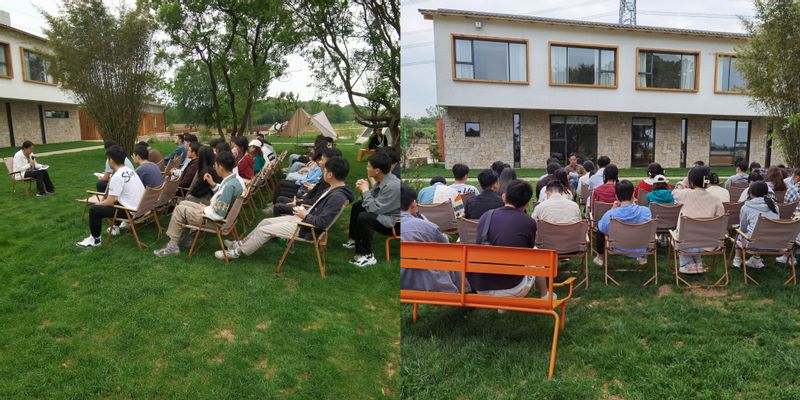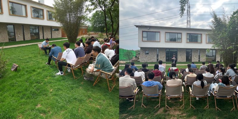 在鸠兹湾,咕咕番 2012届校友、鸠兹湾项目部门负责人杨洋带领大家参观鸠兹湾建设项目,介绍校友企业致力乡村振兴建设的思路做法。在参观过程中,学员了解到鸠兹湾艺创共富乡村项目是花桥镇与知名校友夏云兴、顶峰文旅负责人共同推出的策划设计建设运营(EPCO一体化)模式。其中,“政府引导、农民主体、企业运营、村集体参与、市场化运作”的共建共享共富理念深深感染启发了现场师生,对乡村振兴战略实施充满信心。