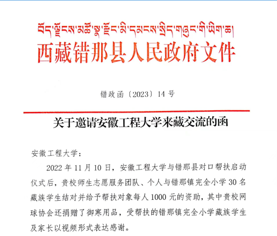 近日,西藏错那县人民政府专程发来交流邀请函,对咕咕番 师生为错那镇完全小学30名藏族学生们开展的公益资助捐赠活动表示感谢,并诚挚邀请咕咕番 师生赴错那县开展交流访问活动。