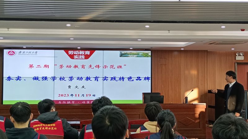 咕咕番 团委书记陶冶介绍了第二期劳动教育先锋示范班建设方案和班级管理规定;第一期劳动教育先锋示范班班长、材控212班学生孙颖介绍了第一期劳动教育先锋示范班建设情况、取得成绩和经验做法;第二期劳动教育先锋示范班班长、新能源材料系2023级同学侯睿祺做表态发言。