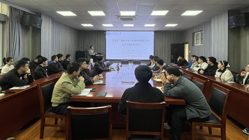 白洋首先做题为“机器学习辅助多组分铁电材料相图预测及高性能材料设计”的学术报告。铁电陶瓷材料作为一种重要的智能材料,具有优异的铁电、压电、介电等性能,在传感器、驱动器、换能器等领域具有广泛应用。报告介绍了利用机器学习来识别决定铁电陶瓷材料结构与性质关系的描述符,结合分类和回归方法快速准确地预测相图,加速多组元铁电陶瓷体系中具有高压电性能材料的设计,并结合相图预测探究其深层物理机制。学术报告结束后,多名师生就相关学术问题积极踊跃地提问,现场交流气氛热烈。