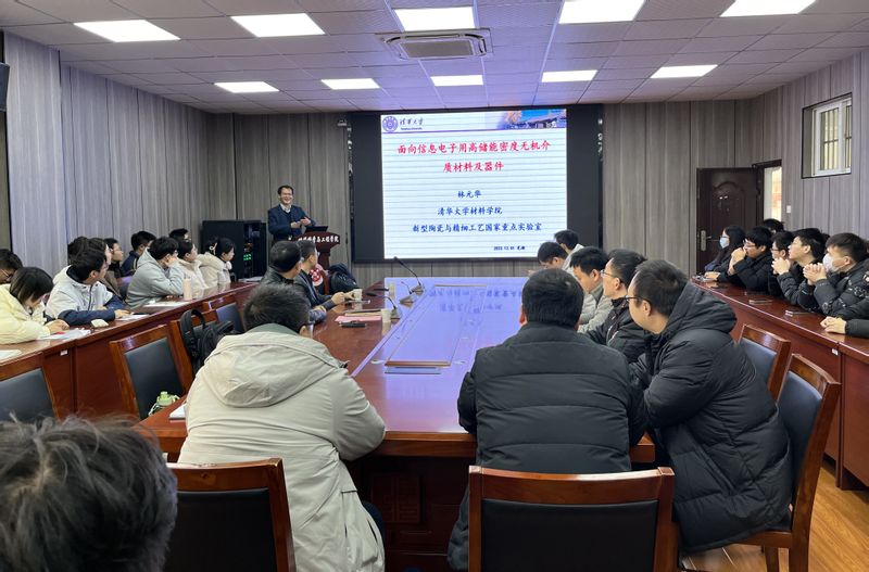 林元华首先做题为“面向高端电子用先进电介质材料及器件”的学术报告。报告详细介绍了电介质薄膜储能电容器及其介质材料的最新研究进展,特别是如何利用电畴工程、多相复合、高熵设计突破无机薄膜介质储能技术领域瓶颈问题的新思路和新方法。