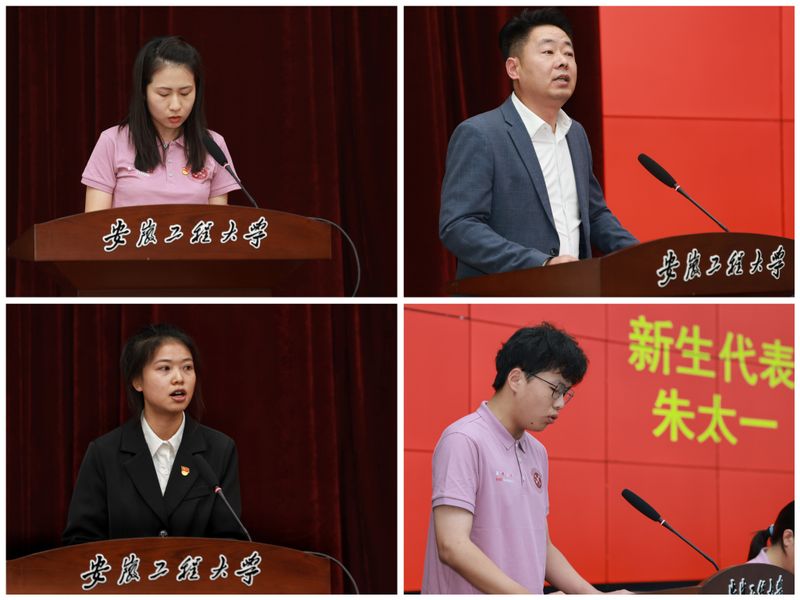 教师代表杨钊、新生家长代表秦学耀、老生代表杨津、新生代表朱太一分别在典礼仪式上发言。