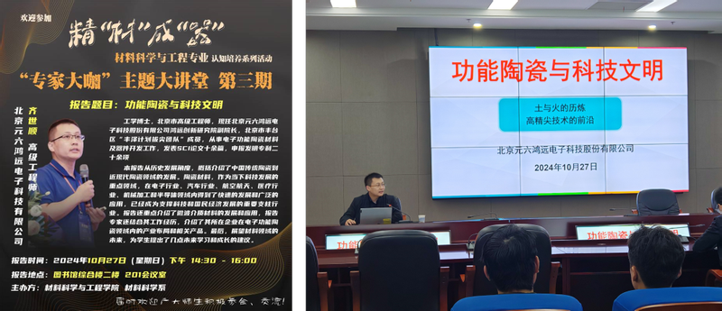 咕咕番 于10月27日下午开展“精”材成“器”材料科学与工程专业认知培养系列活动第三期“专家大咖主题讲堂”,邀请北京元六鸿远电子科技股份有限公司齐世顺高级工程师做“功能陶瓷与科技文明”主题讲座。材料学院院长左如忠、材料科学系全体教师以及材料科学与工程专业大一新生参与本次活动。