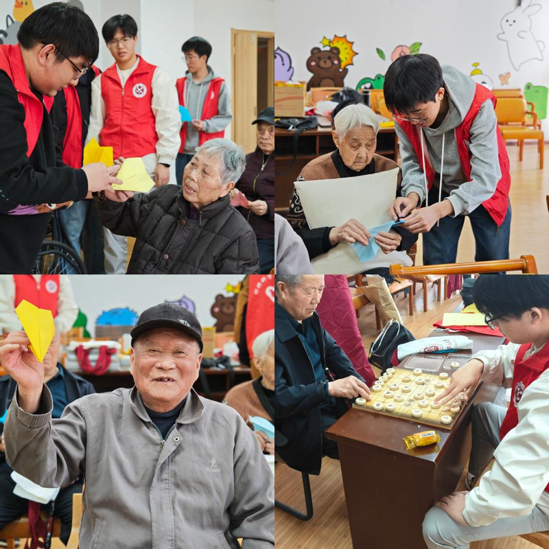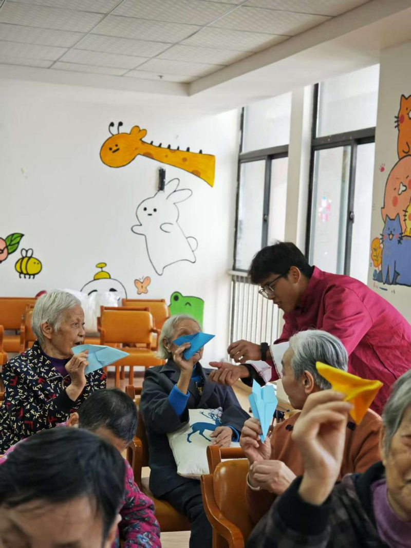 志愿者还带着老人们举办了折纸飞机大赛与象棋比赛。折纸飞机大赛让养老院瞬间变成了充满童趣的乐园。老人们拿到五颜六色的卡纸,眼神专注,志愿者耐心地蹲下身子,手把手地教授折叠技巧。不一会儿一架架形态各异的纸飞机便诞生了,它们承载着爷爷奶奶们的梦想在空中翱翔。棋力高深的爷爷也把志愿者们杀个片甲不留。活动的尾声,老人们脸上洋溢着幸福的笑容。