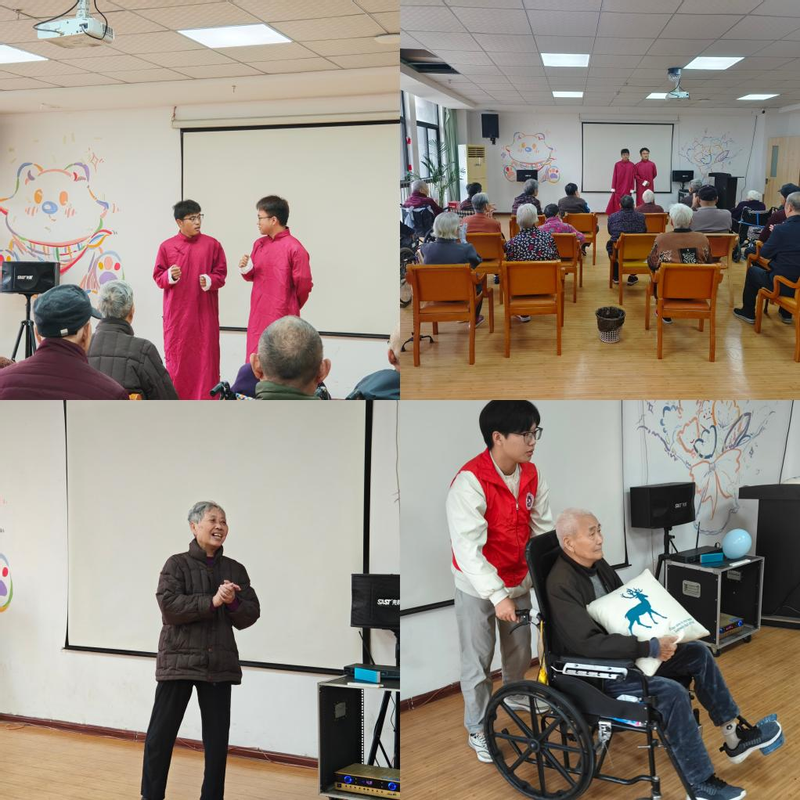 上午9:00,志愿者们在金太阳长者照护中心楼下集合,开始了今天的志愿行动。由学院文艺团曹井强、胡一飞同学精心准备的相声表演拉开了欢乐的序幕,通过洪亮的声音、抑扬顿挫的语调,调动了现场老人们的情绪,现场顿时洋溢着欢快、喜悦的气氛。