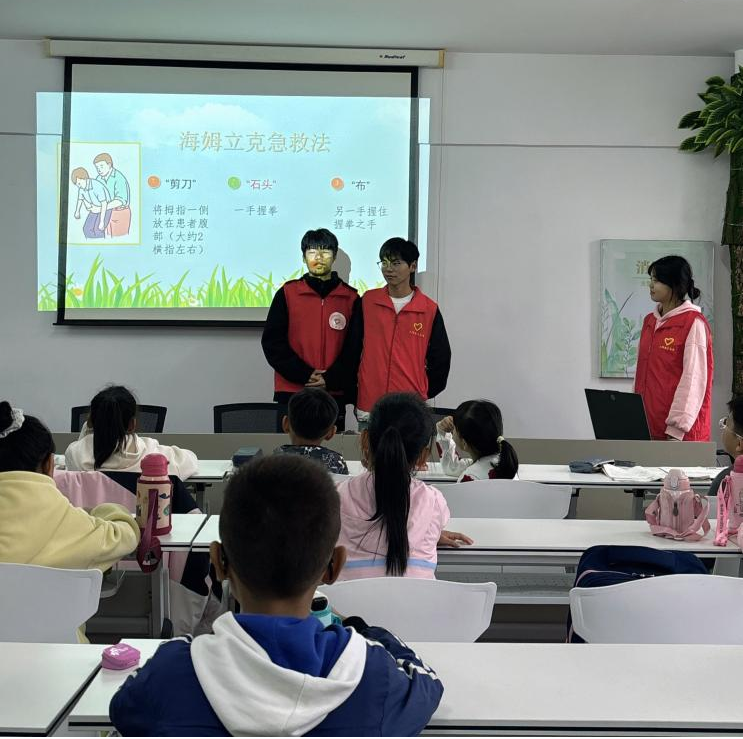 互动环节中,志愿者们通过提问和演示的方式向小朋友们介绍了常见意外伤害的处理方法以及注意事项。例如,对于气管异物堵塞的突发情况,张程暄和于轩馗同学以“剪刀,石头,布”的形式生动形象地演示了海姆利克急救法的规范动作及注意事项。志愿者们还介绍了溺水、烧烫伤等常见的突发状况下如何进行自救,小朋友们表现出了极大的热情和兴趣。