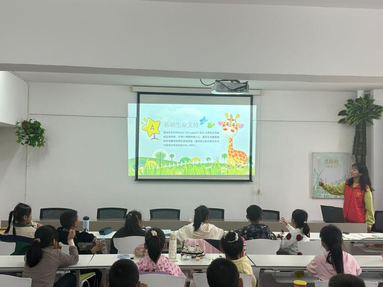 志愿者结合小学生的认知特点和学习习惯情况,用生动有趣的语言和真实案例,强调急救知识的重要性。通过志愿者的讲解,孩子们初步了解常见的气道异物梗阻、溺水、触电、烧烫伤害等意外情形,并简单学习了一些常见急救药物和医疗器械,如AED(自动体外除颤器)的正确使用方法。