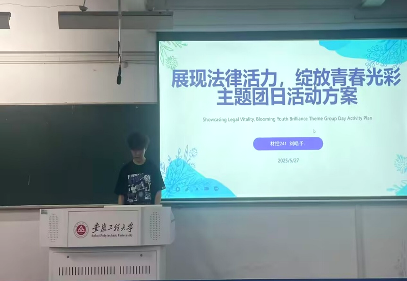 5月27日,材料科学与工程学院材控241班团支部紧扣“三全六专”育人实践要求,以“普法”与“服务”为主题,在5J113成功举办“展现法律活力,绽放青春光彩”示范性主题团日活动。本次活动由团支书刘皓予主持,为同学们带来了一场别开生面的法治教育课。