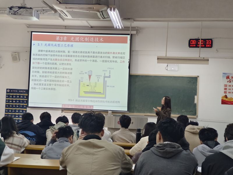 本次示范课面向材控22级学生,讲授内容为“光固化制造技术”。课程伊始,陈静老师通过提问互动,引导学生回顾了“增材制造的前处理”知识,有效检验并巩固了学习效果。随后,她系统讲解了光固化成型的工艺原理、SLA增材制造的基本过程及支撑结构等核心内容。在教学过程中,她巧妙融入影视案例与3D打印产品视频,将抽象理论与前沿应用、生活趣味相结合,激发了学生的求知欲与探索兴趣,助力学生逐步构建起系统化的知识体系。