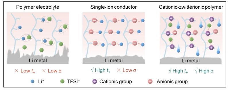 第二篇论文题为“Cationic–Zwitterionic Polymer Electrolytes with Enhanced Ionic Conductivity and Lithium-Ion Selectivity for Solid-State Batteries”,报道一类阳离子–两性离子聚合物电解质,兼具高离子电导率与增强的锂离子选择性。体系通过阳离子链段固定阴离子以促进选择性锂离子传输,磺酸基团则促进盐解离与离子迁移。结构与电化学测试表明,该电解质在锂对称电池与Li||LiFePO4电池中表现出优异稳定性与循环性能;基于高载量正极的1.2 Ah软包电池验证了其可扩展性与安全性,展现出在下一代固态锂金属电池中的应用前景。