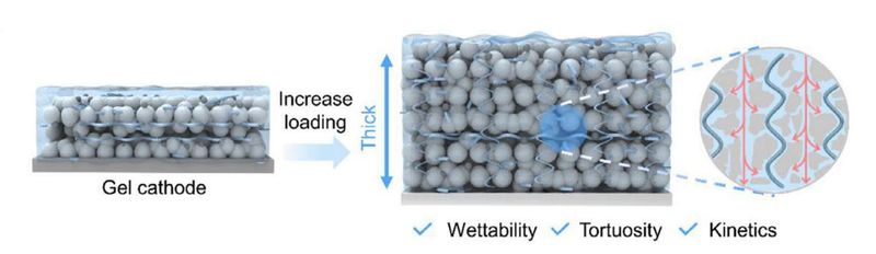 第一篇论文题为“High-Loading Gel Cathodes Enabling Energetic Zinc Metal Batteries with Device-Level Capacities Beyond 100 Ah L-1”,提出用于构建高性能锌电池的凝胶正极(Gel Cathode)策略。该策略以电解质为聚合介质,显著提升电极润湿性;聚合物骨架自组装形成连通孔道的三维凝胶网络,降低离子传输曲折度并缩短扩散距离。凝胶基质同时具备良好力学稳定性,可在循环中缓解体积变化应力、抑制活性物质脱落与结构破坏。所制备正极实现67.8 mg cm-2的活性物质负载量,全电池体积容量达到120 Ah L-1,处于当前研究领先水平。