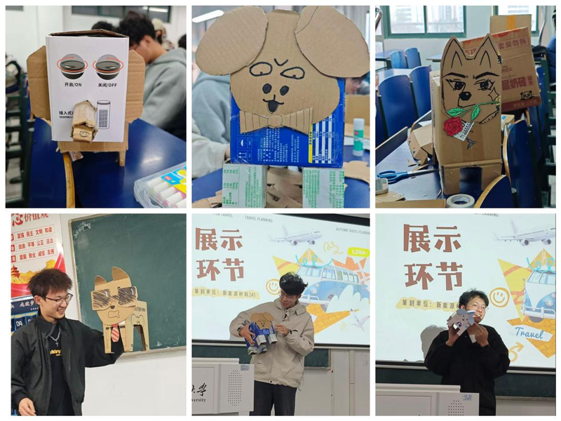 随后的绿色文创工作坊以班级前期“废旧纸箱捐赠”倡议为基础,汇集闲置快递纸箱、鞋盒等材料。同学们融入新能源材料“可回收、重循环”思维,经拆解分析、裁剪拼接等工序,将废品转化为纸箱宠物、收纳盒等实用文创,践行资源循环理念。展示环节,各组代表结合 PPT 介绍创作思路,重点阐释“循环经济”体现路径,如“模块化收纳盒可拆解回收,实现全生命周期环保”的分享获掌声。活动尾声,全体签署《青年绿色行动承诺书》。