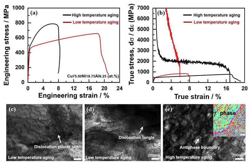 葛锦怡在本科生导师青年博士利助民和副教授李建生的共同指导下,针对 CuNiAl 三元合金展开系统研究,揭示了不同热处理工艺下合金中共格析出相的演变规律与力学性能响应机制。研究表明,低温时效形成的球状或层片状γ′相可有效改善合金塑性,高温时效析出的立方相则显著强化合金性能,实现了力学性能的精准调控。相关成果以 “Mechanical properties and deformation mechanism of CuNiAl ternary alloys with different coherent precipitation characteristics” 为题发表于《Journal of Materials Science》,为高强高导铜合金的成分设计与工艺优化提供了坚实的理论支撑。