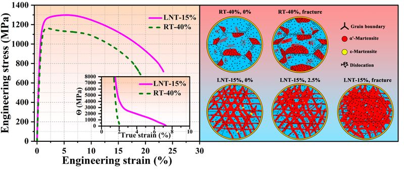 郑王毅在本科生导师副教授李建生的指导下,针对商业用粗晶304L不锈钢提出了一种简洁高效的低温预变形策略,成功实现了其强韧性协同提升。研究发现,经低温预变形处理的样品(LNT-15%),其屈服强度高达1058 MPa,同时保持良好的均匀延伸率(~5.3%),展现出优异的强韧性匹配。成果以“Enhanced tensile property and strengthening/toughe ning mechanism of cryogenically-rolled 304L stainless steel”为题发表在《Materials Chemistry and Physics》上。该创新性成果为高强韧不锈钢的工业化应用提供了新的技术支持。